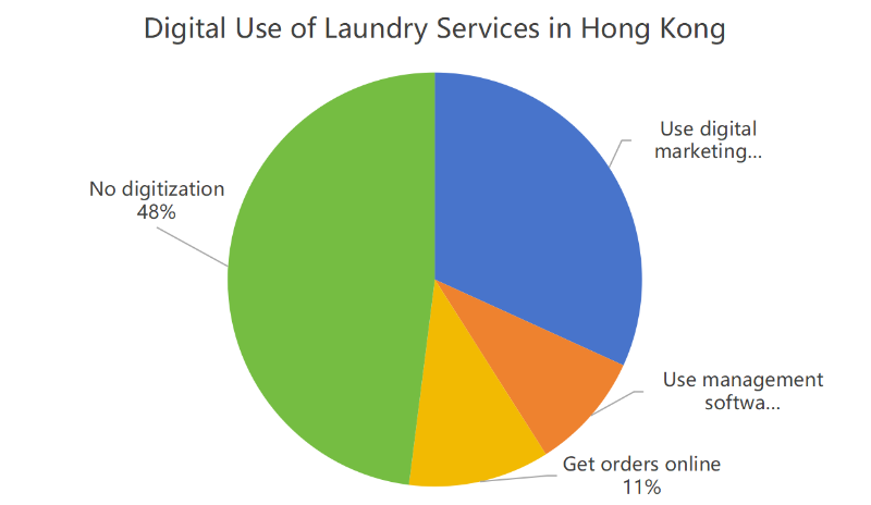 설문조사 결과에 따르면 홍콩의 디지털 혁신은 ’ 우리나라 세탁산업은 아직 초기 단계이다. 응답한 기업 중 디지털 애플리케이션을 사용하지 않는 기업은 48%였으며, 세탁망 주문 접수 시스템은 약 11%, 고객 주문 창고 관리 시스템, RFID 시스템, 고객 관계 관리 시스템, 물류 정보 관리 시스템, ERP 시스템은 10% 미만이었다. 그래서 우리는 ’ 디지털 혁신을 위해 큰 노력을 기울이고 있습니다.